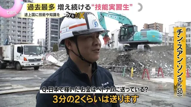 Anh Chin Xuan Son (30 tuổi) đã đến Nhật Bản cách đây 6 năm với tư cách là thực tập sinh kỹ năng và sau đó đã vượt qua kỳ thi. Hiện tại, anh đang làm việc với tư cách là một người có tư cách lưu trú "Kỹ năng đặc định", yêu cầu chuyên môn cao hơn. (Anh Chin Xuan Son) "Ở Việt Nam, lương hơi thấp nên tôi đến Nhật Bản." Q. Bạn có gửi tiền kiếm được ở Nhật về Việt Nam không? "Tôi gửi khoảng 2/3."