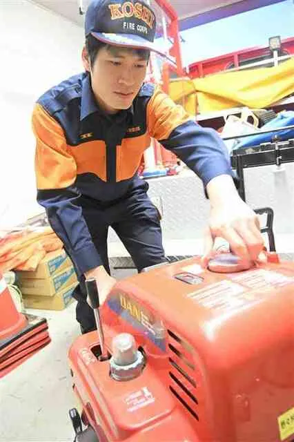 Anh Toku Chuan, lính cứu hỏa tự vệ thành phố Koshi, kiểm tra thiết bị cứu hỏa – Ngày 14, thành phố Koshi.