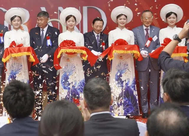 Chủ tịch Yamamoto Ryosuke (thứ 2 từ phải) và các thành viên khác phát biểu tại lễ khai trương khách sạn Super Hotel tại Hà Nội, Việt Nam vào ngày 5 (Kyodo)