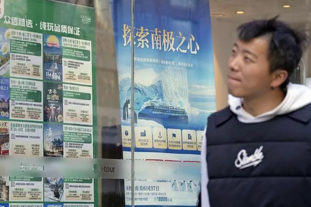 Áp phích quảng cáo du lịch được treo tại một công ty du lịch ở Bắc Kinh. Không có áp phích nào về Nhật Bản = Ngày 27 (Kyodo)