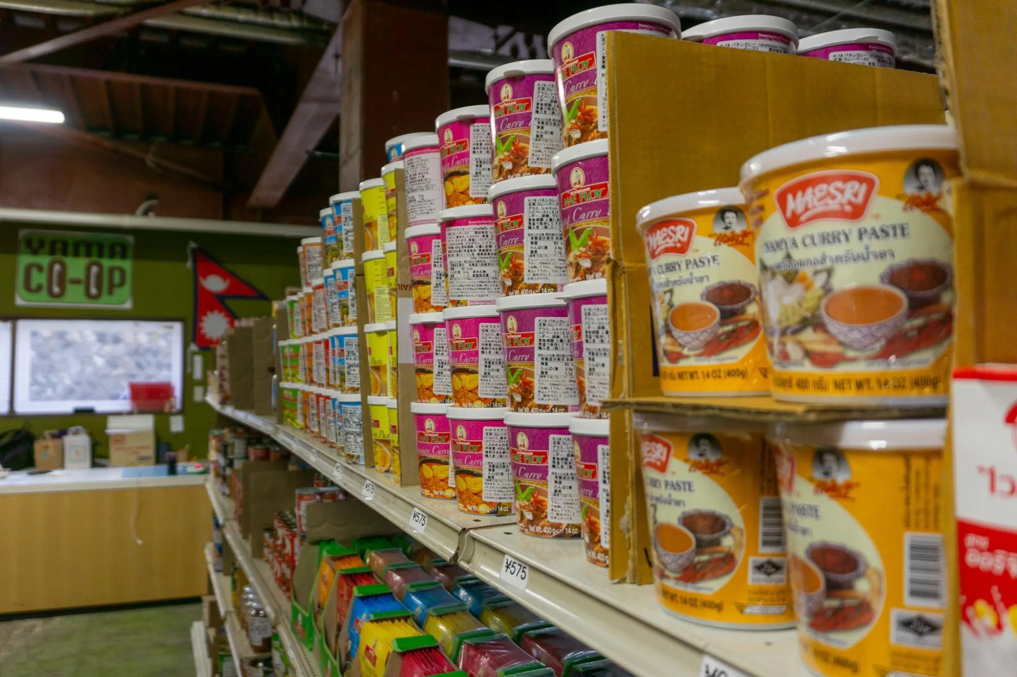 Bên trong cửa hàng, các gói hàng với màu sắc nổi bật như đỏ, vàng, xanh lá cây xếp thành hàng dài. Đây là "Yamacoop", một cửa hàng chuyên bán thực phẩm nhập khẩu từ các nước châu Á như Thái Lan, Việt Nam, Nepal.