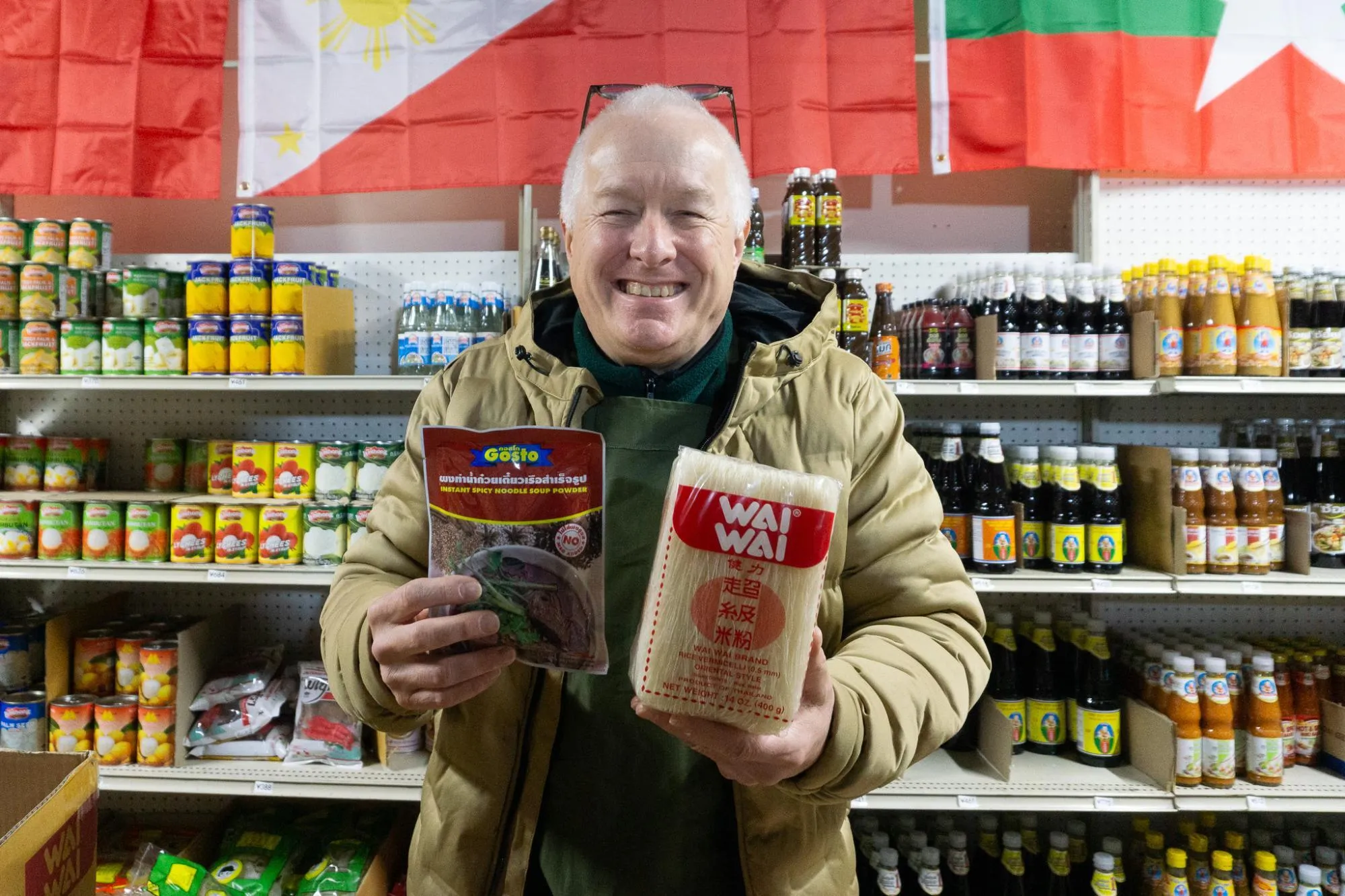 Ông Kevin Mayerson. Các sản phẩm yêu thích của ông là nước súp mì ramen vị hoa hồi và quế (trái), và bún của một nhà sản xuất Thái Lan (phải).