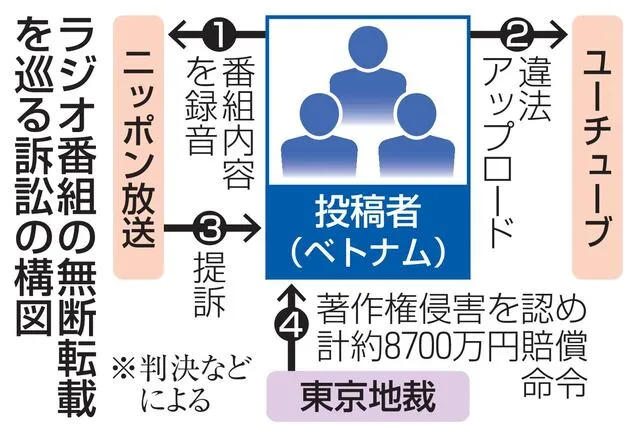 Trong vụ kiện do Nippon Broadcasting đệ trình, cáo buộc 3 người đang cư trú tại Việt Nam đã đăng tải trái phép chương trình radio "Tư vấn cuộc sống qua điện thoại" lên YouTube, Tòa án Địa phương Tokyo (Chánh án Motoyuki Nakajima) đã phán quyết rằng việc đăng tải là bất hợp pháp, yêu cầu xóa video và bồi thường tổng cộng khoảng 87 triệu yên, đúng như yêu cầu. Thông tin này được hãng Kyodo News đưa tin vào ngày 24.